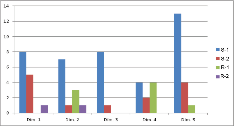 GRAPH I. Number of items with a difference >3 between the analysis of phase A (stereotypes [S-1] and ruptures [R-1], according to GS_5x4) and the analysis of phase B (stereotypes [S-2] and ruptures [R-2], according to MIEG_3ESO).
