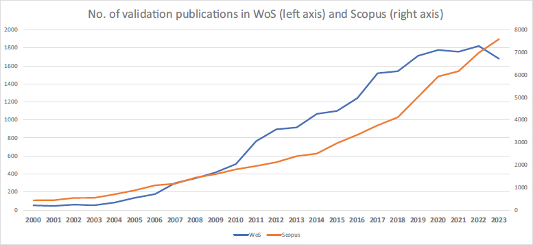 FIGURE I. Evolution of the number of scale validation publications in WoS and Scopus
