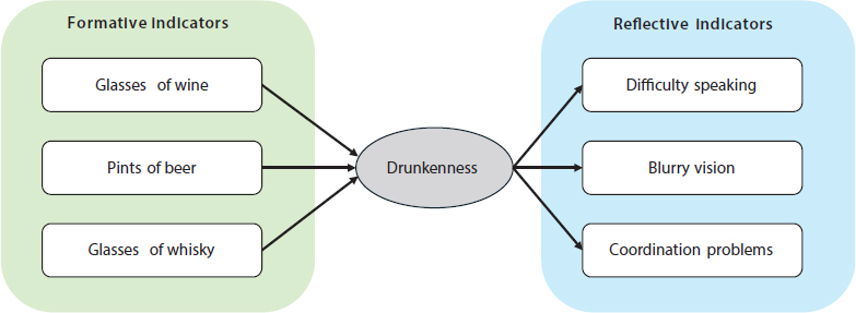 A classic example of the difference between reflective and formative composites in the example of drunkenness (Figure II) (Chin, 1998). In this case, if we were to model drunkenness reflectively, the indicators would be “double vision”, “difficulty speaking” or “coordination problems”, such that an increase in drunkenness would increase its indicators. On the contrary, if drunkenness were a formative composite, it would include indicators such as “number of beers”, “number of glasses of wine” or “number of glasses of whisky”; in this case, increased drunkenness would not mean a rise in all indicators.