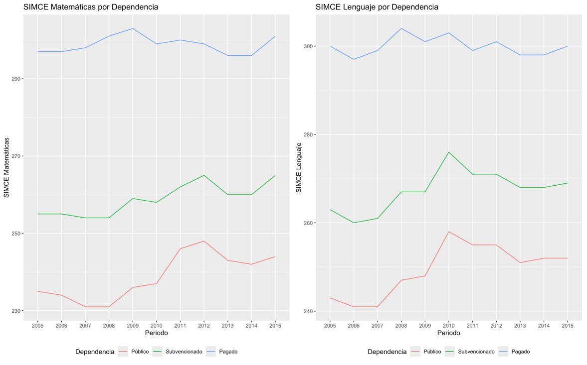 Los bajos resultados de los establecimientos municipales chilenos en evaluaciones estandarizadas son una lamentable constante del sistema educativo. Es así como al comparar la evolución de los resultados SIMCE (Prueba Estandarizada aplicada a diferentes niveles educativos en Chile, con cobertura nacional), tanto en las asignaturas de matemáticas como en lenguaje, es posible observar que los colegios particulares y particulares subvencionados obtienen año a año mayores puntajes que los establecimientos pertenecientes al sector municipal, tal como lo muestra el “Gráfico 1”: