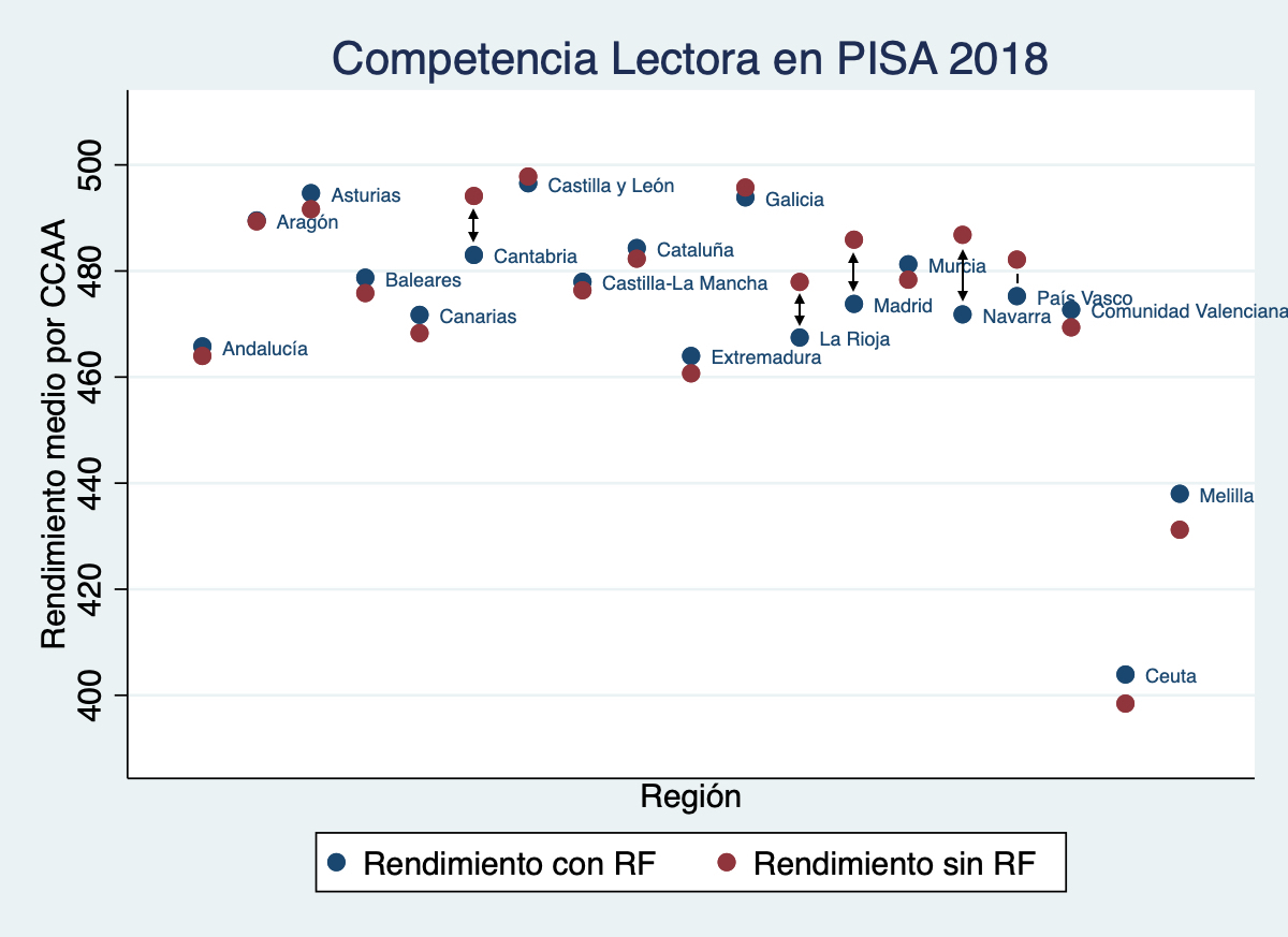 Using these alternative data, we calculated the average performance by region and compared it with the published results that included RF. As shown in Figure 1, the effect of RF is particularly significant in the Autonomous Communities of Cantabria, Madrid, Navarre, La Rioja, and the Basque Country, where the impact diverges from the pattern observed in other regions, whose results are more consistent with each other.