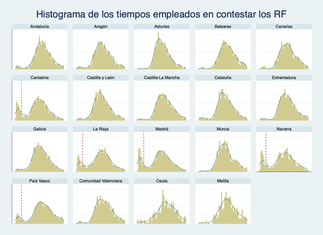 Our first task was to define what we considered anomalous behaviour. To do so, we analysed the response times for the RF items in relation to students’ overall test performance. We then examined how these students were distributed across Autonomous Communities and what their main characteristics were. Finally, using a logit model, we investigated what factors might have triggered such anomalous behaviour.