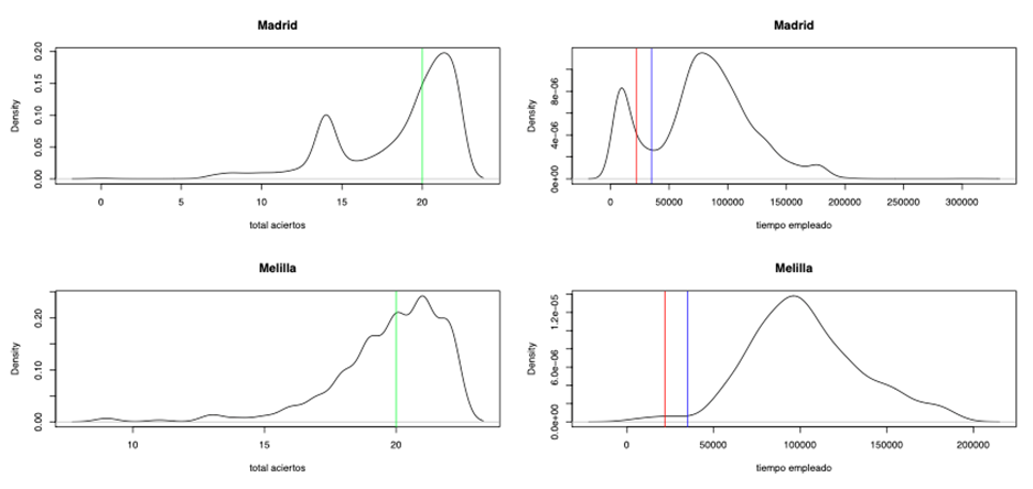 However, an extraordinary finding emerged when analysing response times, that is, the total time each student spent answering the 22 questions. A significant proportion of students (up to 15% in some Autonomous Communities) completed all 22 items in under 22 seconds, which is far too little time. This was possible because the items were displayed consecutively on the device, and the answers (“yes” or “no”) always appeared in the same position on the screen. As a result, students could simply tap repeatedly on the same box to finish this section in under 22 seconds, typically getting about half of the answers correct. Figure 2 highlights these anomalous response-time patterns in the Autonomous Communities of Madrid, Cantabria, Navarre, La Rioja, and the Basque Country.