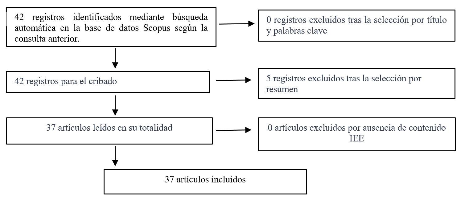 Es decir, buscamos en el título, el resumen y las palabras clave artículos sobre "value added" o "value-added" o "growth curve" o "growth model" o “school effectiveness” o “educational effectiveness”, que también incluyen "multilevel" o "hierarchical", publicadas a partir de enero de 2000, cuyos autores estuvieran afiliados a organizaciones españolas o portuguesas, y cuya área temática fueran las ciencias sociales. Este proceso de selección automatizado dio como resultado 42 artículos de investigación. A continuación, tras examinar los resúmenes, cinco artículos se consideraron fuera de ámbito y se excluyeron. Un análisis del texto completo confirmó estas exclusiones, lo que dio como resultado un corpus final de 37 artículos. En este sentido, los artículos incluidos describen investigaciones científicas que, en conjunto, cumplen los siguientes criterios: