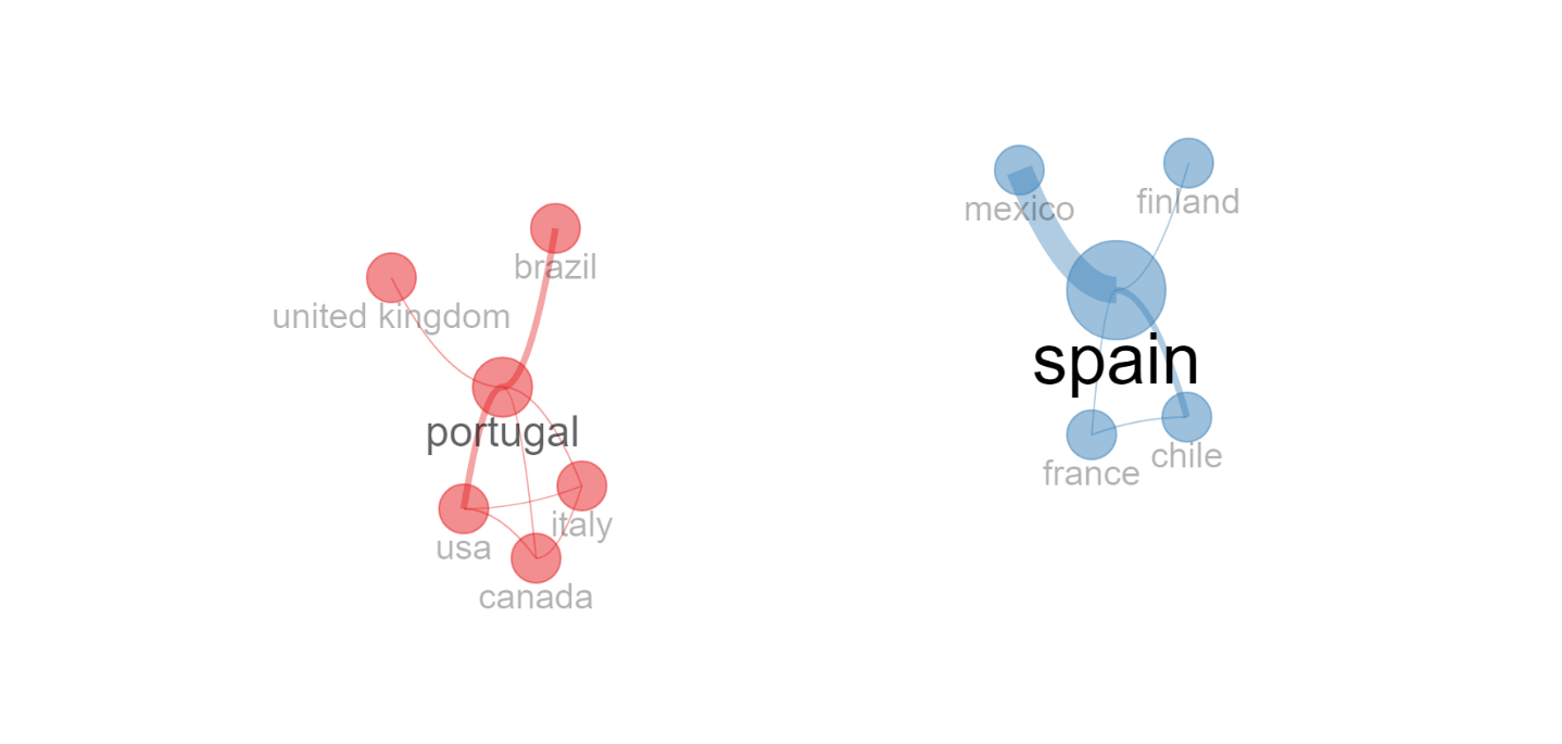 La red de colaboración entre países (Figura III) muestra dos grupos distintos de autores sin conexiones entre ellos. El grupo de la izquierda está formado por autores portugueses que colaboran con investigadores de Estados Unidos, Canadá, Italia, Brasil y Reino Unido, mientras que el de la derecha está formado por autores españoles que trabajan con colegas de Finlandia, México, Francia y Chile. Estos dos grupos no tenían conexiones, lo que indica que no existe una red de colaboración entre Portugal y España.