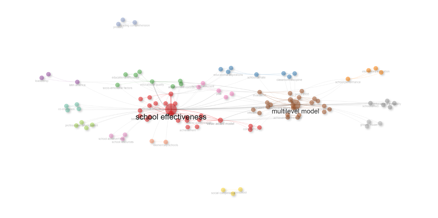 Grupo de eficacia escolar (rojo): Este grupo gira en torno a conceptos destinados a mejorar el rendimiento y la calidad de los centros escolares. Palabras clave como "mejores prácticas", "investigación sobre escuelas eficaces", "efectos contextuales", "sentido de pertenencia", "rendimiento académico", "evaluación educativa", "enseñanza", "formación del profesorado" apuntan a estrategias para mejorar la enseñanza y el aprendizaje. La inclusión de "evaluaciones a gran escala", "PISA", "modelo de valor añadido" y "modelo de crecimiento lineal y cuadrático" indica una conexión con puntos de referencia y metodologías internacionales para medir la eficacia educativa. Las palabras clave como "coherencia", "estabilidad", "evaluación escolar", "efectos escolares" y "responsabilidad escolar" ponen de relieve el enfoque central del grupo de eficacia escolar, haciendo hincapié en temas relacionados con la evaluación y la mejora del rendimiento y los resultados de los centros escolares. Estas palabras clave sugieren un fuerte énfasis en la medición de la eficacia institucional, la garantía de la responsabilidad y el mantenimiento de estándares educativos estables. Este grupo refleja un compromiso con la identificación y aplicación de prácticas educativas eficaces, especialmente en contextos diversos como América Latina (Chile y México).