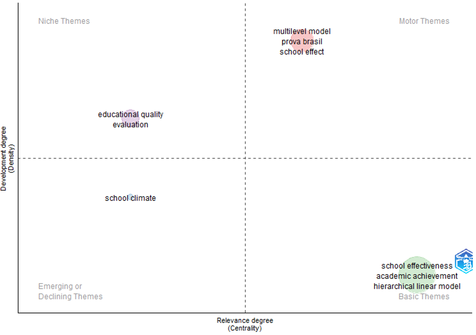 Como se observa en la Figura X, el primer periodo de investigación está marcado por temas como el modelo multinivel, el valor añadido y el estudio longitudinal como temas motores, también incluye el rendimiento escolar como tema nicho. Mientras que en el periodo 2, incluye la evaluación de la calidad educativa, clima escolar y efecto escolar evaluado por Prova Brasil. La evolución temática de la IEE muestra un cambio de enfoque. En el primer periodo (2006-2014), temas como los modelos multinivel, los enfoques de valor añadido y los estudios longitudinales ocuparon un lugar central, con un fuerte énfasis en el rendimiento escolar. En el segundo período (2015-2024), la atención se desplazó hacia la evaluación de la calidad educativa, el clima escolar y evaluaciones como Prova Brasil, lo que indica un enfoque más amplio en los factores académicos y ambientales que influyen en los resultados educativos. En última instancia, la estructura intelectual de la IEE ha evolucionado, y los conceptos fundamentales se han vuelto más interconectados y diversos. El campo ha pasado de centrarse principalmente en el rendimiento escolar y los modelos estadísticos a una consideración más matizada de la calidad educativa, la responsabilidad y los factores socioemocionales, lo que refleja la naturaleza dinámica de la investigación educativa a lo largo del tiempo.