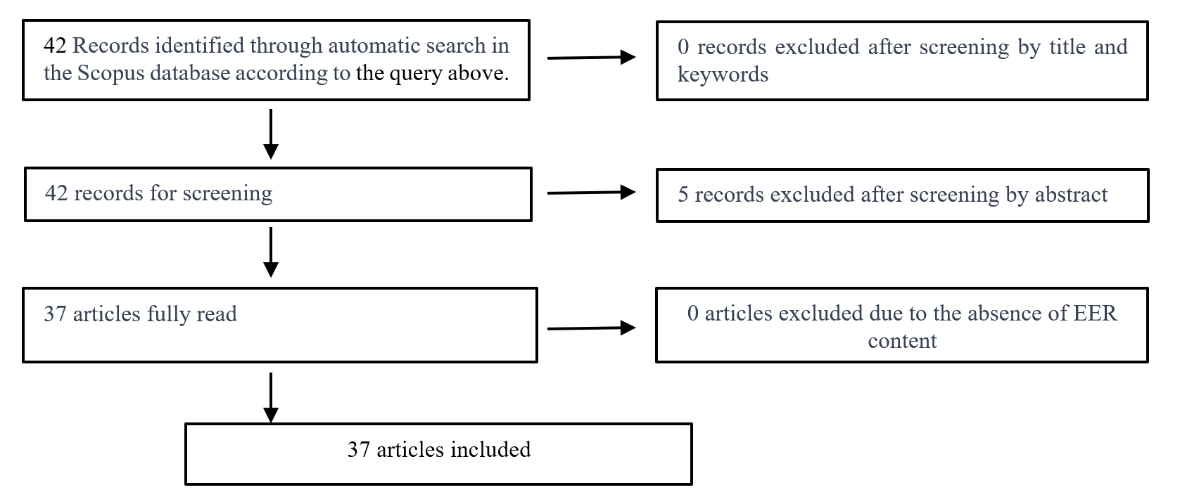The same is to say that we searched in title, abstract, and keywords for articles on "value added" or "value-added" or "growth curve" or "growth model" or “school effectiveness” or “educational effectiveness”, which also include "multilevel" or "hierarchical", were published since January 2000, whose authors were affiliated to Spanish or Portuguese organizations, and journals’ subject area is social sciences. This automated selection process yielded 42 research articles. Next, based on abstract screening, five articles were deemed out of scope and excluded. A full-text analysis confirmed these exclusions, resulting in a final corpus of 37 articles. In this regard, the included articles describe scientific research that cumulatively meets the following criteria: