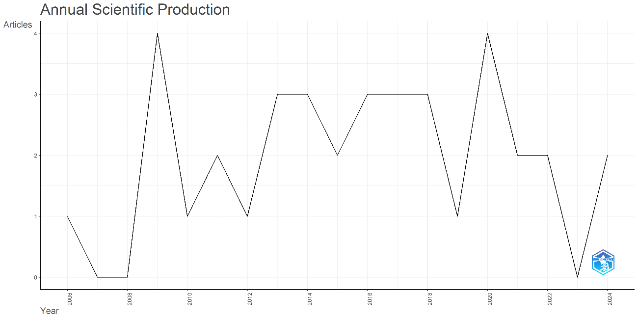 Although the search was conducted after 1999, the corpus spans from 2006 to 2024 and includes 37 articles published in 24 different source titles. The annual production varies from 0 to four papers (Figure I). The total number of authors is 73, with 32.4% involving international co-authorship. On average, there are 2.8 authors per article and 4 papers are single-authored. The number of author’s keywords is 118.