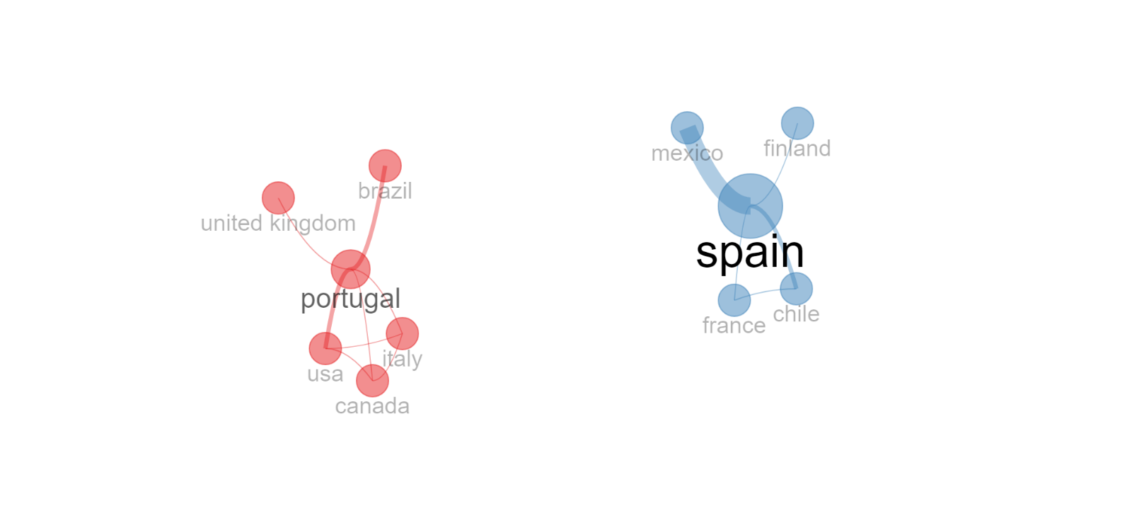 The country collaboration network (Figure III) reveals two distinct clusters of authorship with no connections between them. The left-hand cluster consists of Portuguese-affiliated authors collaborating with researchers from the USA, Canada, Italy, Brazil, and the UK, while the right-hand cluster features Spanish-affiliated authors working with colleagues from Finland, Mexico, France, and Chile. These two clusters had no connections, indicating no collaborative network between Portugal and Spain.