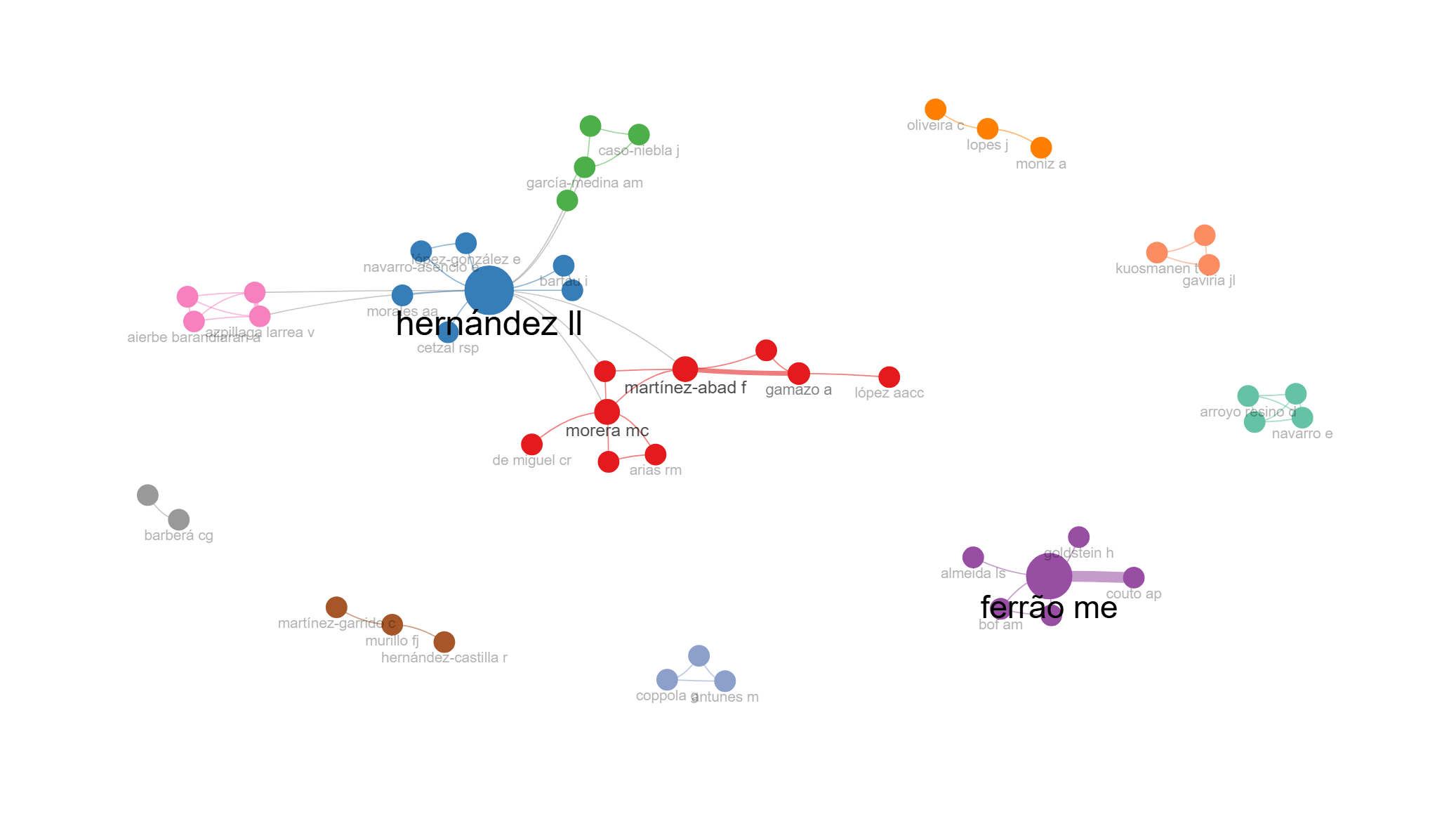 The collaboration network (Figure VII) reveals a strong cluster, highlighted in blue, centered around Hernandez L.L., who has direct or indirect scientific connections with 23 authors, most of them consisting of three clusters highlighted in red, green and pink.