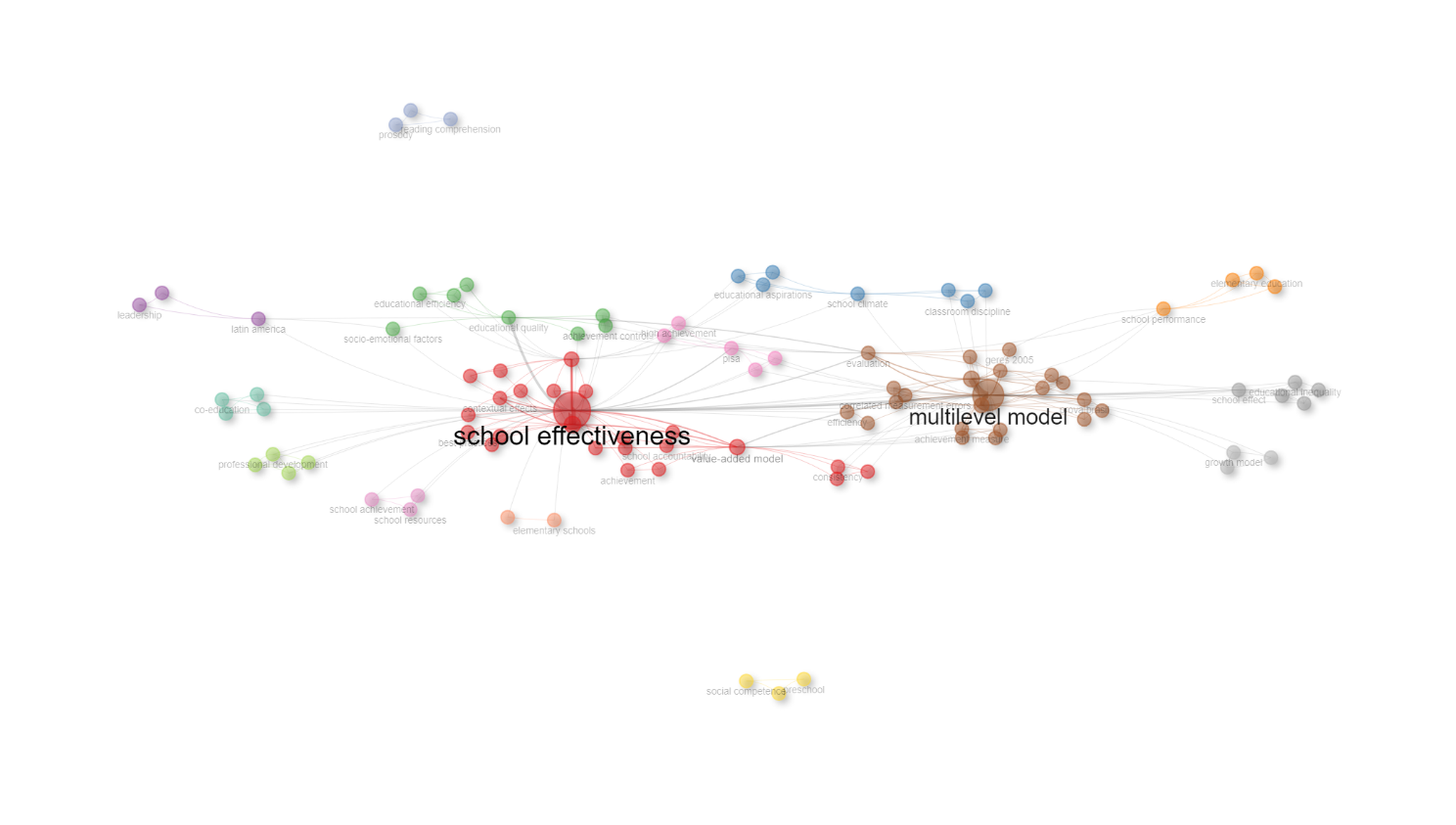 School Effectiveness Cluster (red): This cluster revolves around concepts aimed at improving school performance and quality. Keywords like "best practices", “effective schools research”, “contextual effects”, “sense of belonging”, “academic achievement”, "educational assessment", “teaching”, “teacher education” point to strategies for enhancing teaching and learning. The inclusion of “large-scale assessments”, "PISA", "value-added model" and “linear and quadratic growth model” indicates a connection to international benchmarks and methodologies for measuring educational effectiveness. The keywords like “consistency”, “stability”, “school assessment”, “school effects”, and “school accountability” highlight the central focus of the School Effectiveness cluster, emphasizing themes related to evaluating and improving the performance and outcomes of schools. These keywords suggest a strong emphasis on measuring institutional effectiveness, ensuring accountability, and maintaining stable educational standards. This cluster reflects a commitment to identifying and implementing effective educational practices, particularly in diverse contexts such as Latin America (Chile and Mexico).Multilevel Model Cluster (brown): This cluster emphasizes complex analytical frameworks used to assess educational outcomes. Keywords like "achievement measure", and "differential effectiveness" highlight a focus on measuring student success across various dimensions, while terms such as "educational inequality", “social equity”, “longitudinal study” and "growth model" suggest an interest in understanding how different factors influence equity and educational performance over time. This cluster indicates a nuanced approach to evaluating educational interventions and their impact on diverse populations. Specifically, fluid intelligence, through cognitive abilities (Numerical, Abstract, Verbal, and Spatial Reasoning), is strongly linked to initial math achievement and the rate of improvement over time. The topic of educational evaluation and its purpose are present through the keywords “evaluation”, “school/teacher effectiveness”, “school/teacher accountability”, “school/teacher improvement”. The keywords “latent variable multidimensionality,” “item response theory”, “measurement error”, “correlated measurement errors,” and “reliability” are central to the Multilevel Model cluster, indicating a focus on advanced statistical techniques used to analyze complex educational data. These terms suggest a strong emphasis on the precision and reliability of measurement models, particularly in assessing latent traits and addressing errors in data interpretation within hierarchical or multilevel structures. Educational Quality Cluster (green): Focusing on the social and emotional aspects of education, this cluster includes keywords like "educational quality", "achievement control", "educational efficiency", "educational evaluation", "high schools", "school success", and "student evaluation". These terms highlight the focus on assessing and improving various dimensions of education, including the effectiveness of schools, student performance, and the impact of both cognitive and socio-emotional factors on academic success, particularly in high school settings.