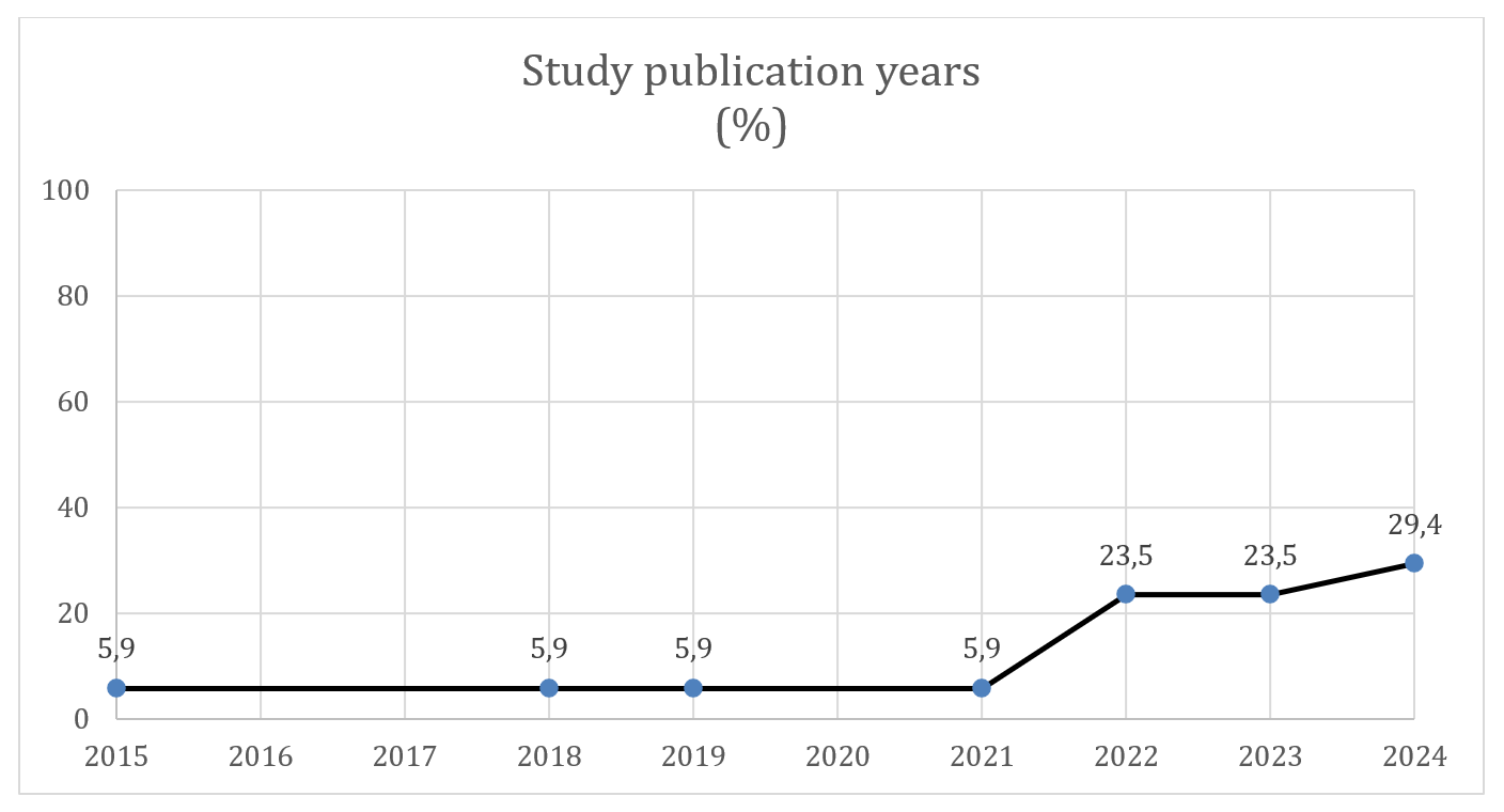 The 17 documents included were published between 2015 and 2024. An increase is seen in the number of publications from 2022 onwards, after which time 76.5% of the studies were conducted. The highest numbers of publications are from 2022, 2023 and 2024 (23.5% and 29.4%, respectively) (Graph I).