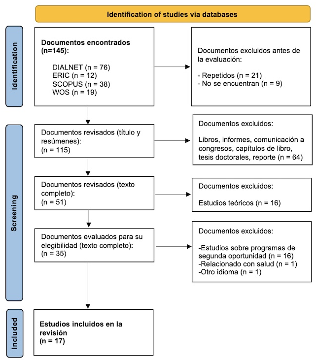 Following three rounds of review, 17 of the 145 documents found met the inclusion criteria. The flow chart (Figure I) shows the reasons why 127 papers were excluded. Articles on “second chance programs” were also discarded if they were related to “compensatory programs” and thus were unrelated to the topic of interest.