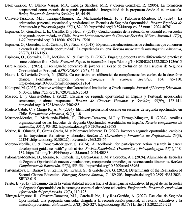 | Chisvert-Tarazona et al. (2024) | Personal, vocational and professional guidance in E2O, analyzing guidance models and processes for transitional training mechanisms for young people in vulnerable situations | Mixed study Semi-structured interviews= 24 principals/directors of studies in E2O, 9 teachers/counselors in secondary schools and 10 company mentors Survey= 351 E2O graduates Evaluation of school activity indicators = 1592 E2O graduates |