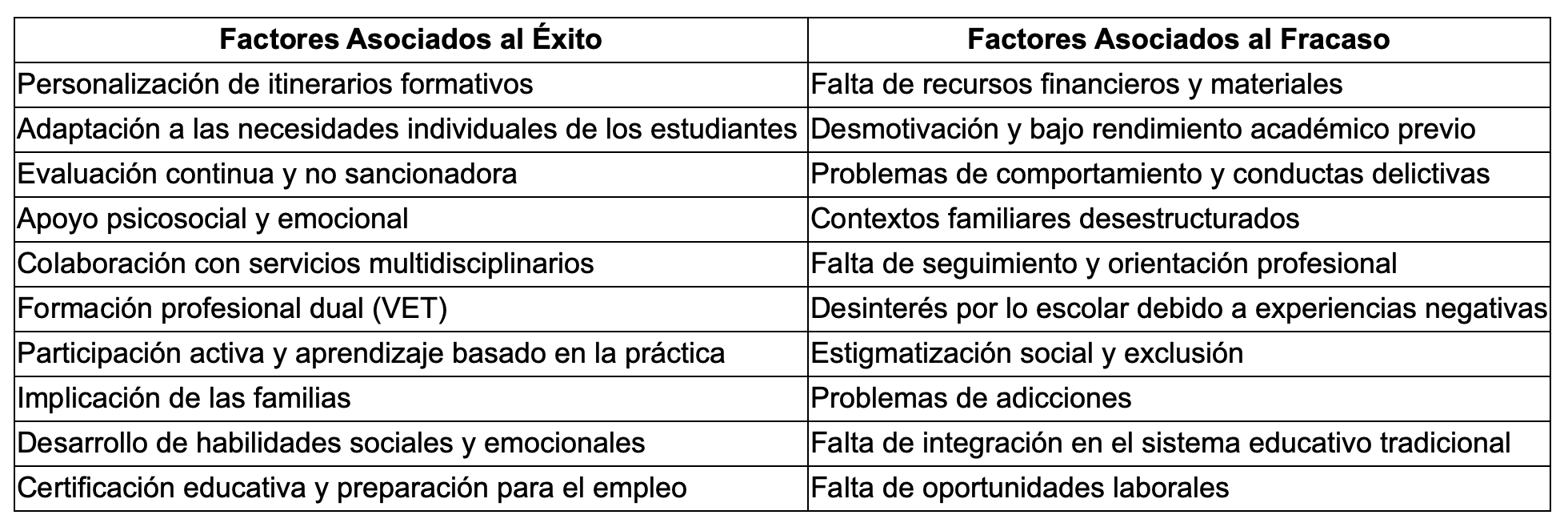 Another key methodology is practice-based learning, which facilitates the acquisition of competencies through real-life experiences, integrating theory and practice (Houot and Lavielle- Gutnik, 2023). Dual vocational education and training (VET), which combines both approaches, prepares students for the job market (Pasternáková et al., 2023). In terms of assessment, E2Cs use ongoing, non-punitive assessments focused on the learning process, as well as self-assessment and constant feedback to foster personal development (Merino et al., 2022; Moreno-Morilla and Romero-Rodríguez, 2024). They provide psychosocial and emotional support through individualized guidance and follow-up to overcome personal and educational difficulties (Báez Garrido et al., 2006). They offer non-academic activities such as sports and art, which contribute to the development of social and emotional skills (Espinoza et al., 2019). Appendix 3 shows a table of factors that contribute to the success and failure of E2Cs, providing a clear picture of the elements that must be considered to improve the effectiveness of these programs.
