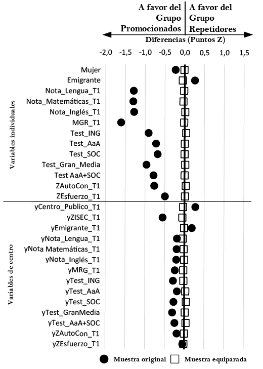 To the best of our knowledge, there are no studies in Spain to date that have included dual control pre- and post-repetition on a single sample. In light of previous evidence (e.g., Allen et al., 2009) the model with least control of bias is expected to show greater effects, in other words to overestimate the probability of low social status students repeating a year. In contrast, better experimental control is expected to demonstrate more moderate effects, which in certain conditions may even dilute statistical significance.