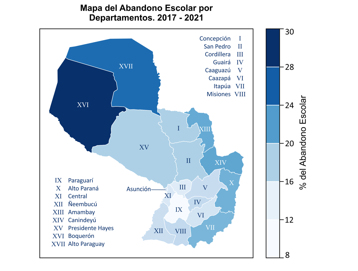Los datos provienen del Registro Único del Estudiante (RUE), administrado por el Ministerio de Educación y Ciencias (MEC) de Paraguay. El RUE centraliza información sobre la trayectoria educativa de los estudiantes a nivel nacional, facilitando el análisis de factores relacionados con la permanencia y graduación escolar. Las instituciones reportan periódicamente al MEC, y esta información se combina con otras bases oficiales para mejorar su precisión (INE, 2024).