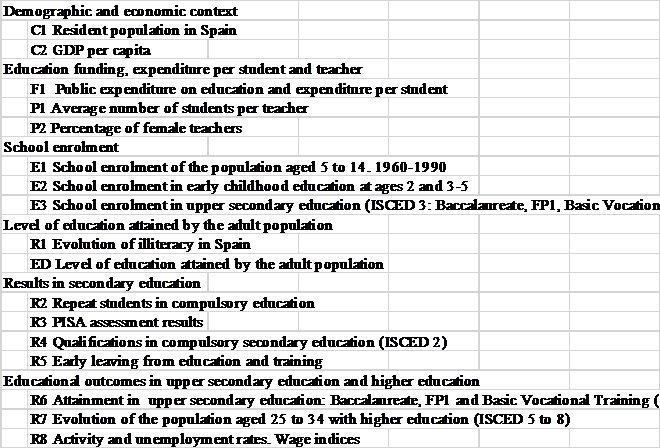 The aim of this article is to offer a very synthetic quantitative overview of some of the most significant indicators, especially those that show the evolution of the main results of Spanish education over the last 50 years. A total of 16 indicators have been selected, two on the demographic and economic context, one on funding, one on expenditure per pupil, one on teachers, three on school enrolment and nine on the results and educational level achieved by the adult population.