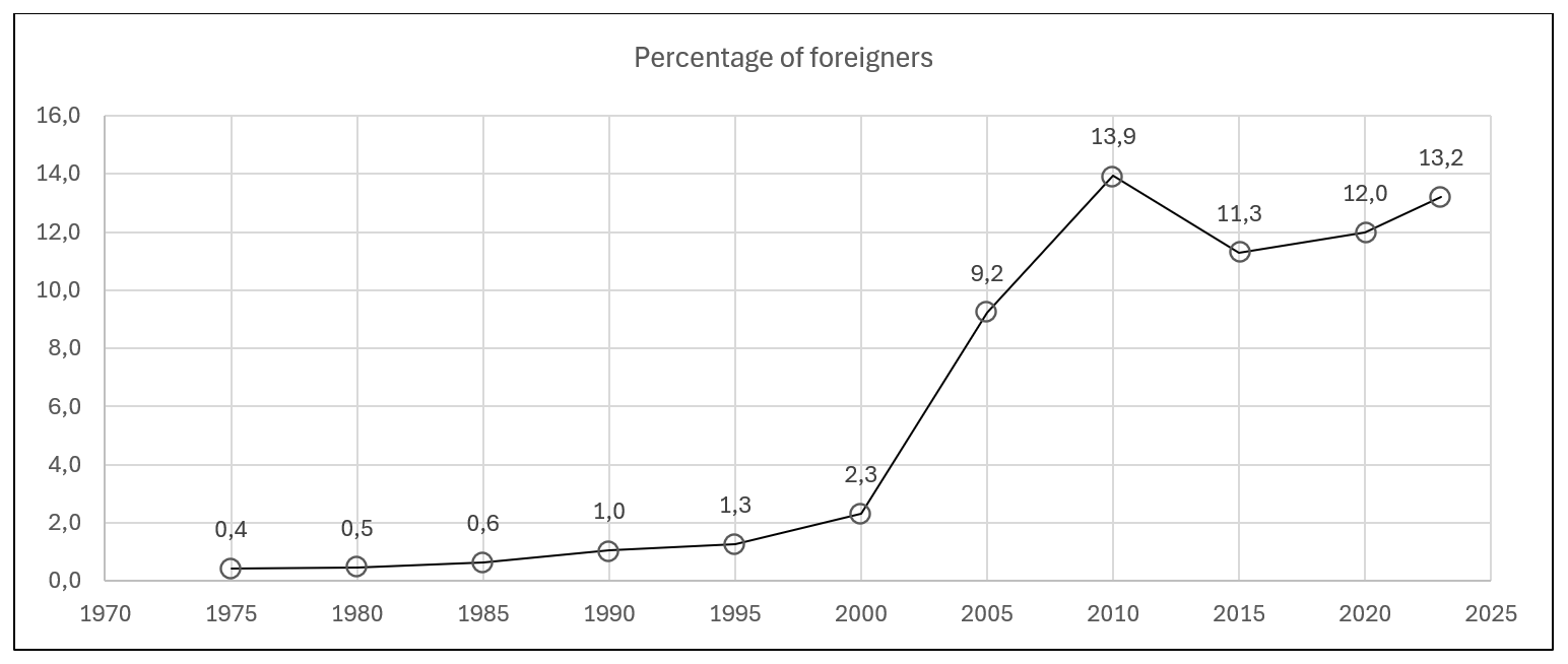 Since 2010, the number of residents decreased slightly, mainly due to the fall in the number of foreigners, 2.6 million fewer, to 11.3% in 2015. From this date, the number of residents recovered to 49.1 million in 2025, thanks mainly to the new increase in the number of foreigners, which recovered 1.9 percentage points between 2015 and 2023. It can be concluded that the evolution of the Spanish population has been stimulated by economic development and that the economy has been favored by the increase in the foreign population residing in Spain