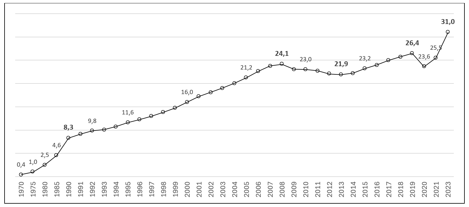 GDP per capita calculated in current prices has risen in Spain from 400 euros in 1970 to 30,968 euros in 2023. (Figure C2.1). (Prados de la Escosura, L. (2021) and INEbase, 2024c). It is a very synthetic indicator of the macroeconomic development of a country, which does not provide information on the particular prosperity of its inhabitants, but it does provide an overview of the vigor of the growth or crises of a country´s economy and allows a comparative view with other countries, i.e. a view with very useful benchmarks.