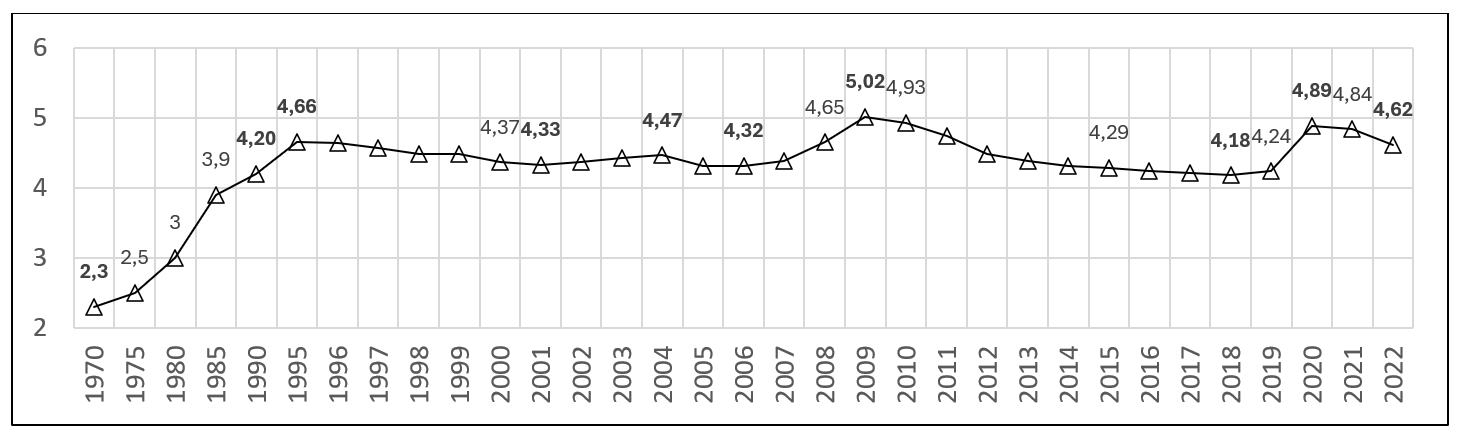 From 1995 to 2006 (4.32%) the previous trend was broken and public spending decreased with slight variations; it recovered between 2006 and 2009 (5.02%), the historical maximum. It decreased again until 2018 (4.18%), grew until 2020 (4.89%), second maximum, to finally drop again to 4.62% in 2022 (MEFP Educa base (2024b). Political changes in the responsibility for education and the economic and COVID crises probably explain these rises and falls since 1995, which leave the final figure in 2022 equal to that of 1995 after these 27 years have elapsed (MEFPD Educa base, 2024b).