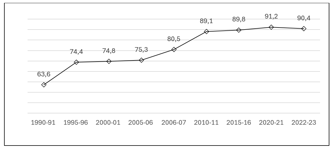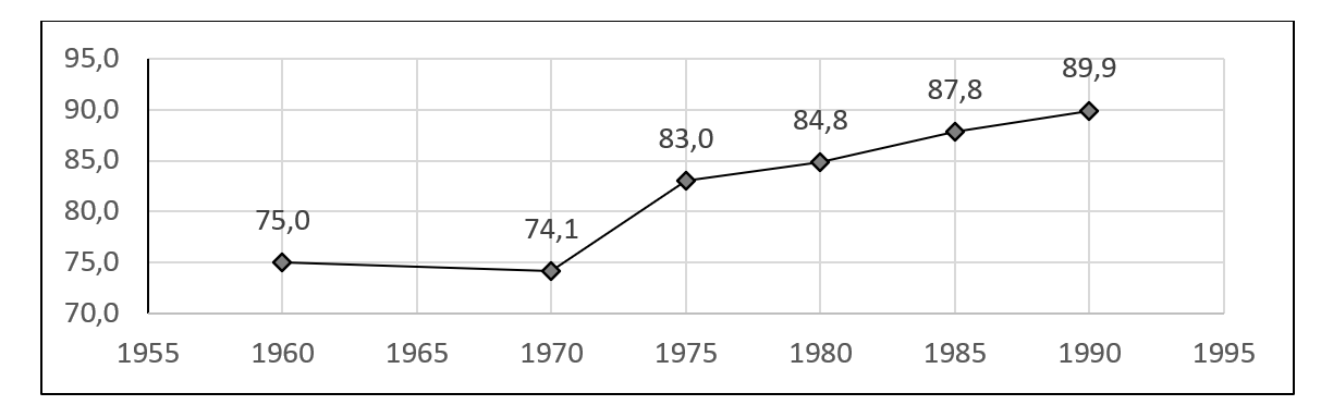 E1 The School enrolment of the population from 5 to 14 years of age increased from 75% in 1960 to 83% in 1975 and 89.9% in 1990. During these years, the curricula outlined in the 1950s and the LGE were implemented, with compulsory education from ages 6 to 14.