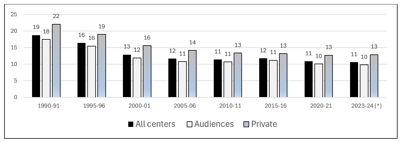 Figure P1 shows the evolution of the average number of students per teacher in General Education MEFPD Educa base, 2024c); in 1990, the average was 19 students per teacher and dropped to 11 in 2010, a figure that has been maintained until 2023-24. In all the years considered, the average number of students per teacher in private schools exceeds that of public schools by 2-4 points. The analysis of these figures must take into consideration the high distribution of private schools in urban areas and the low distribution in rural and depopulated areas.