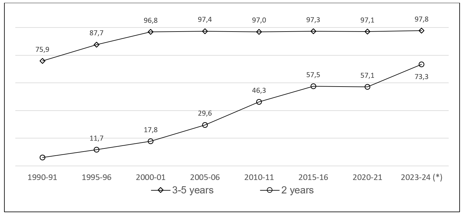 In 1990, net schooling rates for 3 to 5 year olds were 75.9% and reached 97% in 2000, a figure that is considered practically full schooling. Schooling at age 2 was very low in the early 1990s; in 1995 it stood at 11.7%. Over the next 20 years it grew markedly until 2015 (57.5%), and declined slightly until 2020. In the course 2023-24 schooling at 2 years of age has reached 73.3%, with a growth of more than 16 percentage points in the last 3 years.