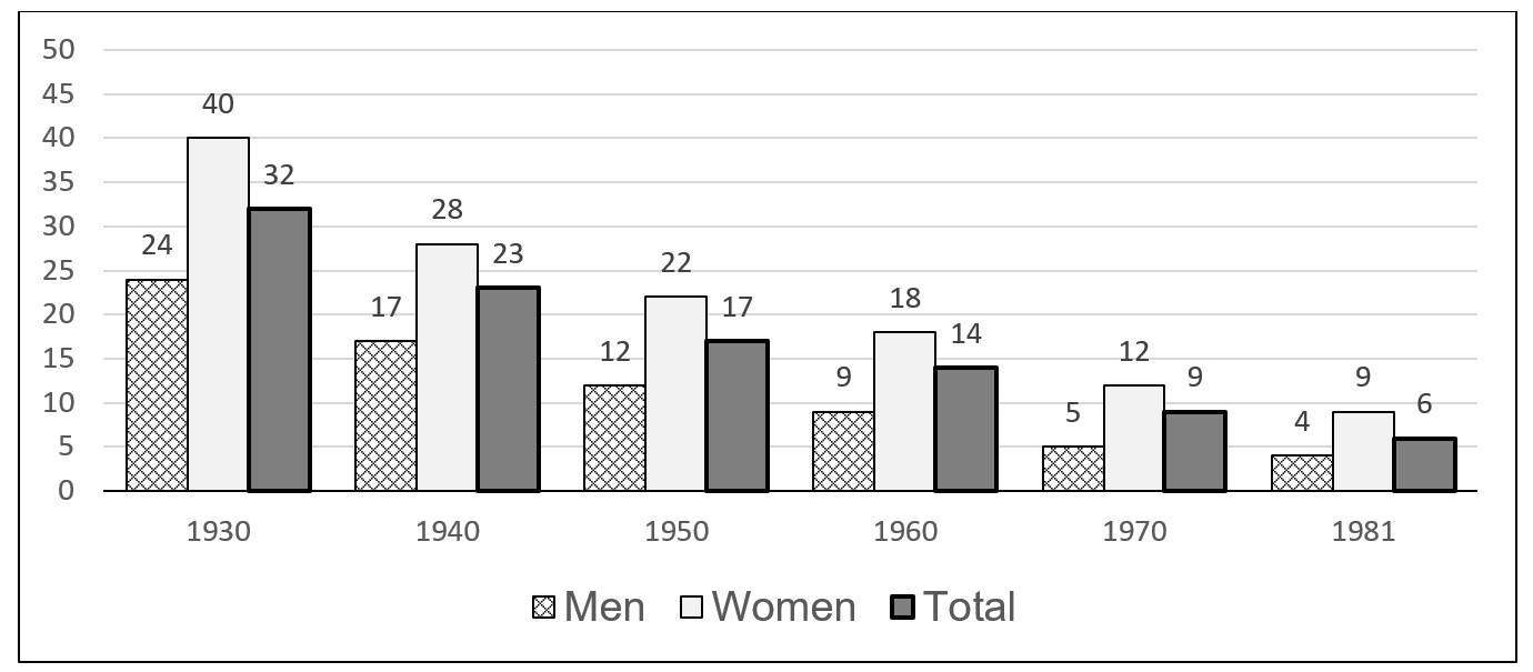 The difference between the male and female rates decreased from 16 percentage points in 1930 to 5 in 1981. Illiteracy among the adult population was reduced in this remarkable way and ceased to be a major educational problem in Spain.