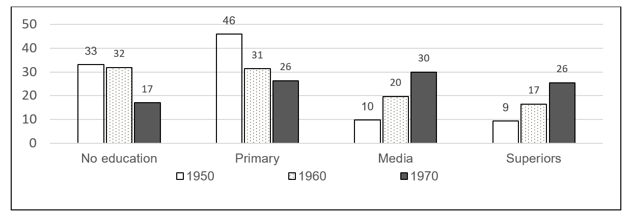 Figure ED.1 shows the percentages of the educational level of the generations born in Spain in the decades indicated (Carreras, A. and Tafunell, X., 2005). Among those born in 1950, 33% of the population had no education, 46% had primary education, 10% had secondary education and 9% had higher education. In other words, in the 60s of the last century, the young people who finished high school and its revalidation, as well as other intermediate studies, did not exceed 10% of the total population, and these same young people mostly went on to complete higher education.