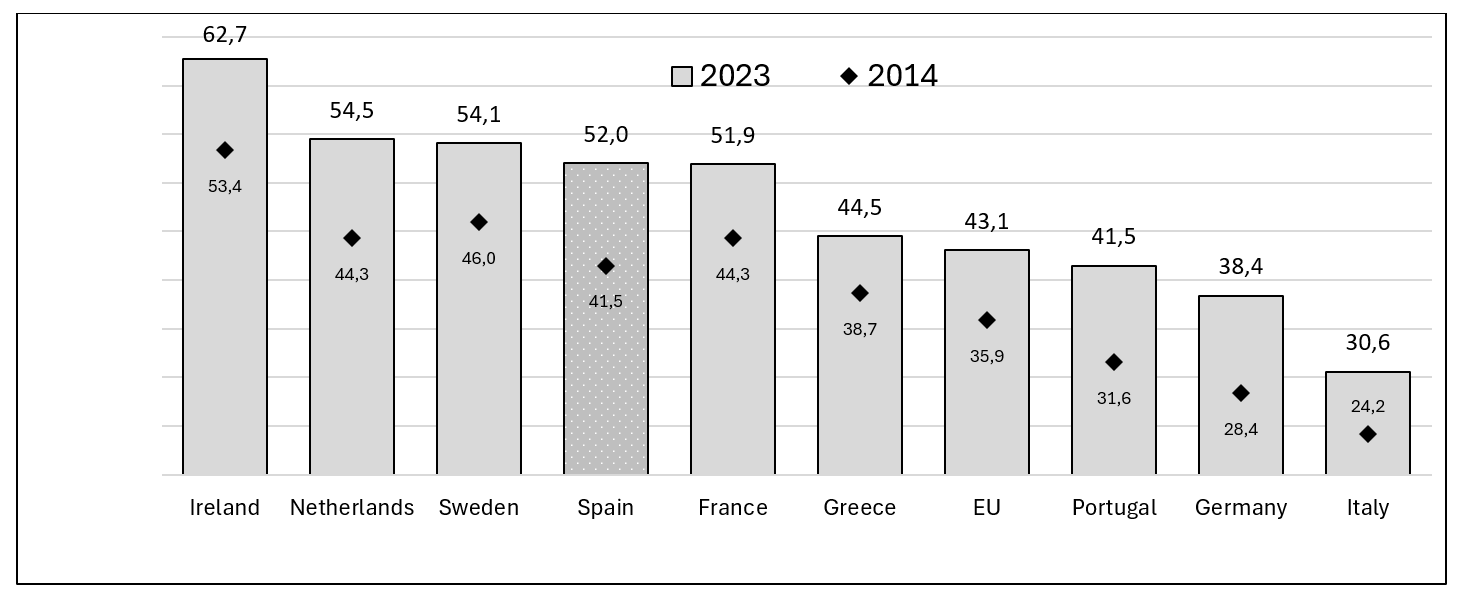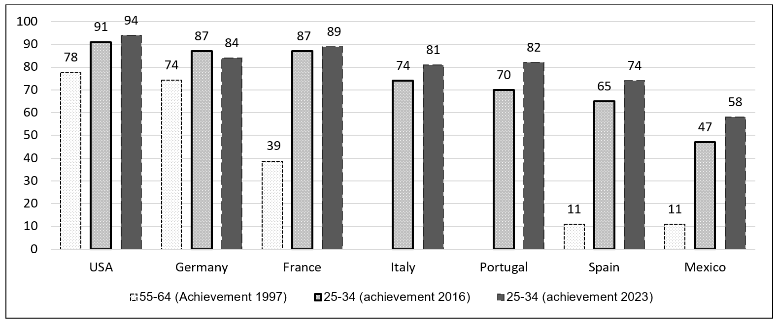 The situation began to change very noticeably since the approval of the 1970 and 1990 education laws. 65% of young Spaniards born between 1982 and 1991, aged 25-34 years in 2016, reached the upper secondary level of education (OECD, 2018). The figure has reached 74% of young people born between 1989 and 1998, who were between 25 and 34 years old in 2023. Progress has been remarkable, although our adult population with that level of education is currently 7-8 percentage points below Italy and Portugal, 10 points behind Germany, 14 points behind France and 20 points behind the United States.