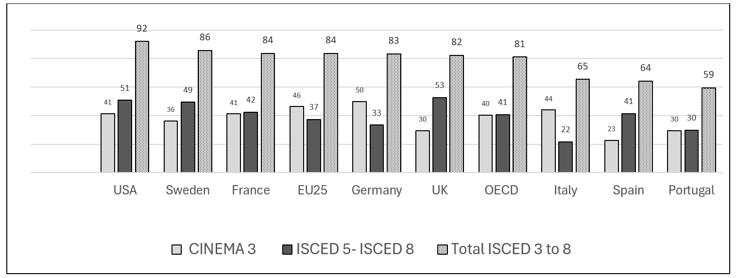 Figure ED.3 plots together the percentages of adults aged 25-64 (populations other than those discussed in the previous figure) who have attained ISCED level 3, ISCED levels 5-8 and the sum total of both percentages (OECD, 2024b). The percentage of Spaniards with ISCED 3, 23%, is half the EU average and 17 points lower than the OECD average. However, the percentage of Spaniards with ISCED 5-8, 41%, is equal to the OECD average and higher than those of the EU, Germany, Portugal and Italy. Thus, the main Spanish difficulty with respect to the levels of education attained by the adult population lies in upper secondary education, ISCED 3, and not in higher education.