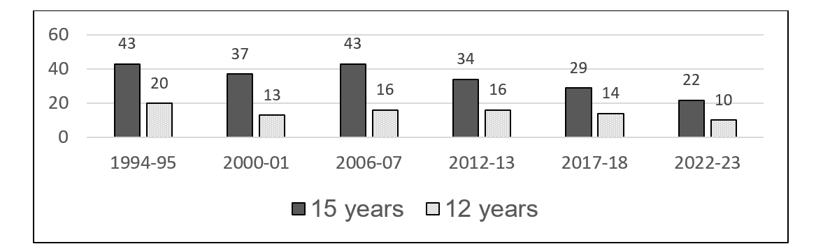 Sources: OECD 2011: Education at a Glance 2011, Education at a Glance 2018 Table A1.2, Education at a Glance 2024. Table A1.2