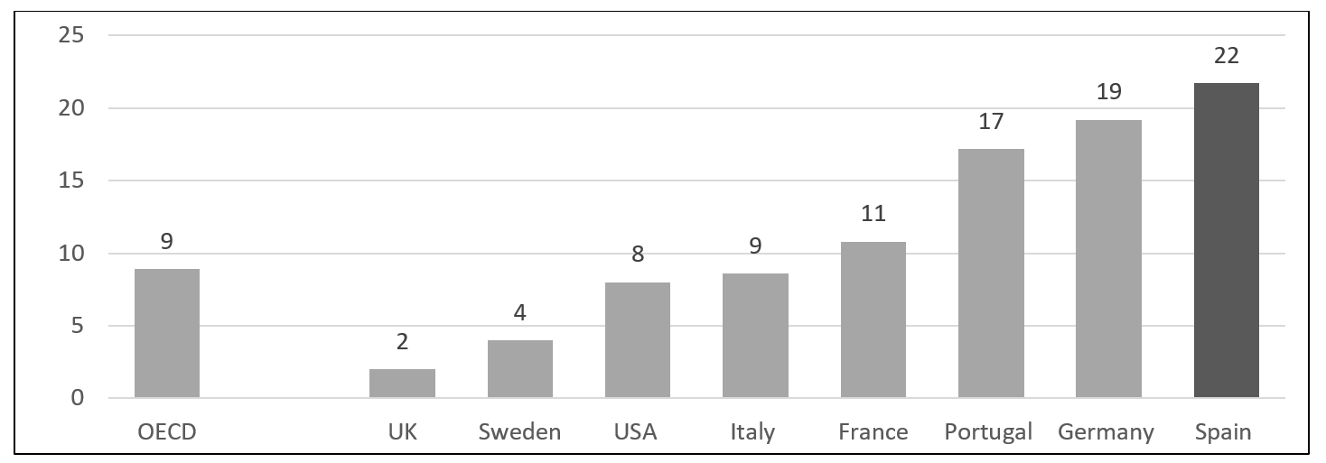 The Spanish figures for public spending on education are far from those of countries (World Bank Group, 2024) such as Sweden (6.7%), USA (5.6%), UK (5.4%), France (5.2%) and the Netherlands (5.1%). Around the Spanish figures are those of Portugal (4.6%), Canada (4.6%) and Germany (4.5). Finally, the figures for Italy (4.0%) and Japan (3.5%) are lower.