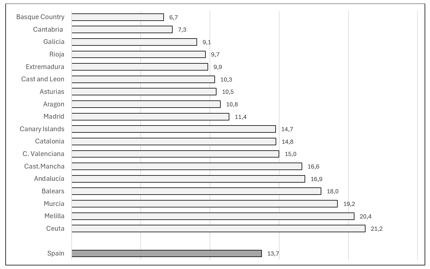 Figure C2.2 (Annex) shows a selection of data from the World Bank Open Data (2023), corresponding to 2021, including some of the main Western economies and those of our environment. GDP is presented measured in current international dollars, converted using PPP (Purchasing Power Parity). The Spanish figure, 40,592, is clearly lower than those of the economic powers (USA, Germany, UK, France...), close to those of Japan and Italy, and slightly higher than those of Portugal and other European countries.