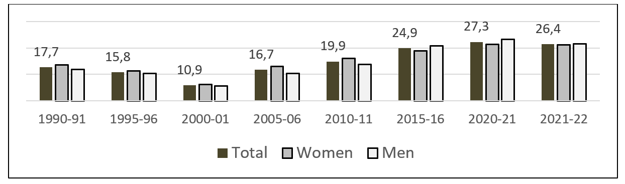 The evolution of the percentage of women with respect to the total faculty went from 62% in 1990-91 to 72% in 2020-21 (Figure P2, Annex) (MEFPD Educa base, 2024d). The percentages of women in 1990 were in private schools three to four percentage points higher than in public schools, but the figures were equalized as of 2010.
