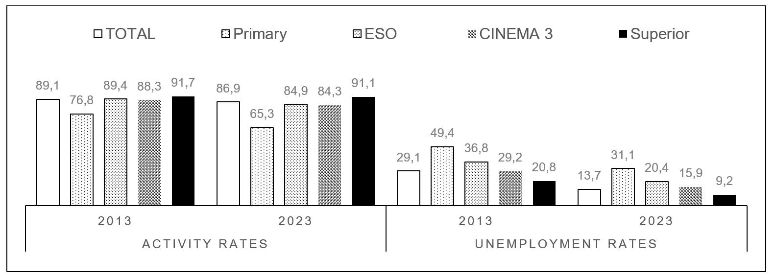 Between 1960 and 1990, the "gross schooling rate for the population aged 14 to 19 years did not exceed 40% (Carreras, A. and Tafunell, X., 2005) (Figure E3.1, Annex). Between 1990 and 2023, schooling at 17 years of age has evolved as shown in Figure E3.2 (MEFPD Educa base, 2024f).