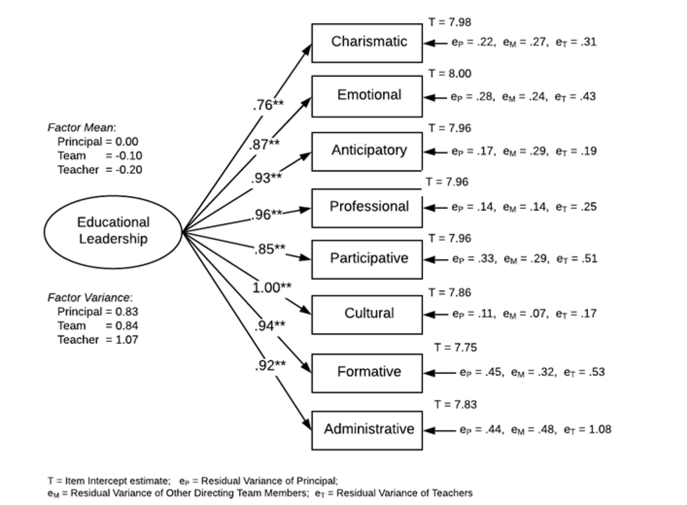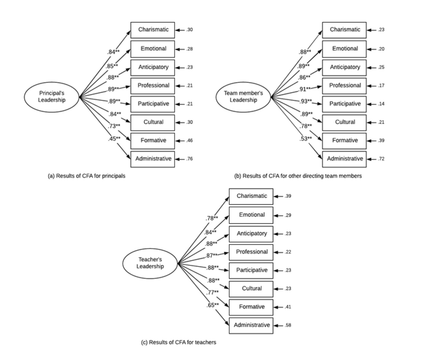 The purposes of this study were to (1) examine the factor structure of the PLEADS; (2) test the measurement invariance properties of the factor structure of the PLEADS across groups of principals, directing team members, and teachers; and (3) study the effect of the types of assessors and assesses on the determination of the importance of leadership.