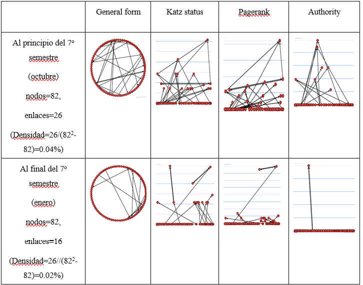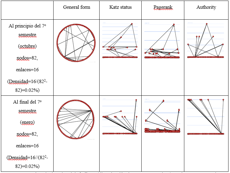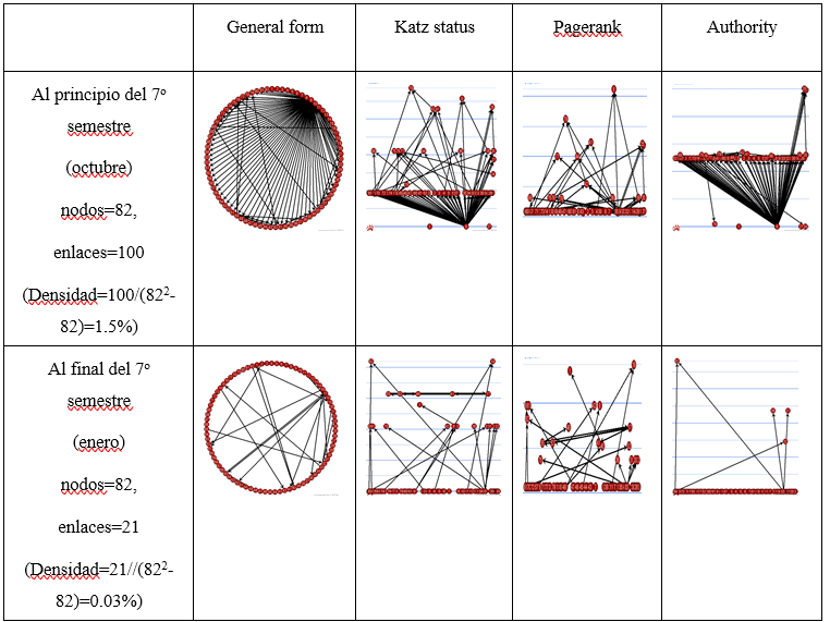Se utilizó el software Visone 1.1 para el cálculo de las variables de la red (centralidades: in- and out-degree, Katz Status, pagerank y authority). Los datos, tanto los de la red como los de la no-red, se introdujeron y procesaron en el SPSS. Se ha aplicado la prueba de Spearman test entre el eje temporal (principio y final del semestre) y las variables de red para detectar la evolución, así como entre los valores de las variables de red al principio y al final del semestre para examinar la estabilidad. Se ha preferido esta prueba bivariable a un análisis multivariable, ya que no es paramétrica y proporciona una visión clara de las correlaciones.