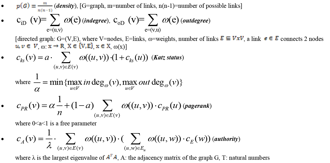 Los indicadores fueron calculados y normalizados (%) por el software Visone. (Aunque se puede acceder a sus fórmulas en Internet, también se presentan aquí)2 (Brandes & Wagner, 2004; Jünger & Mutzel, 2012). Se interpretaron estructuralmente de la siguiente manera: 1) In-degree (y out-degree) representa una jerarquía ocasional (nodos contactados directamente). 2) Katz Status expresa una jerarquía acumulativa formada por contactos sucesivos. 3) Pagerank representa una jerarquía distributiva, que expresa cómo se transfiere sucesivamente el valor (por ejemplo, el insulto) de cada alumno a los demás. Es muy parecido al Katz Status. Sin embargo, pagerank representa capas jerárquicas más sutiles y, por tanto, los valores atípicos están limitados. 4) Authority puede percibirse como un indicador de una competitividad cualificada. En concreto, Authority señala a los estudiantes que establecen más vínculos con otros estudiantes, que intentan desarrollar relaciones (practicando la agresión, el maquiavelismo o el acoso).