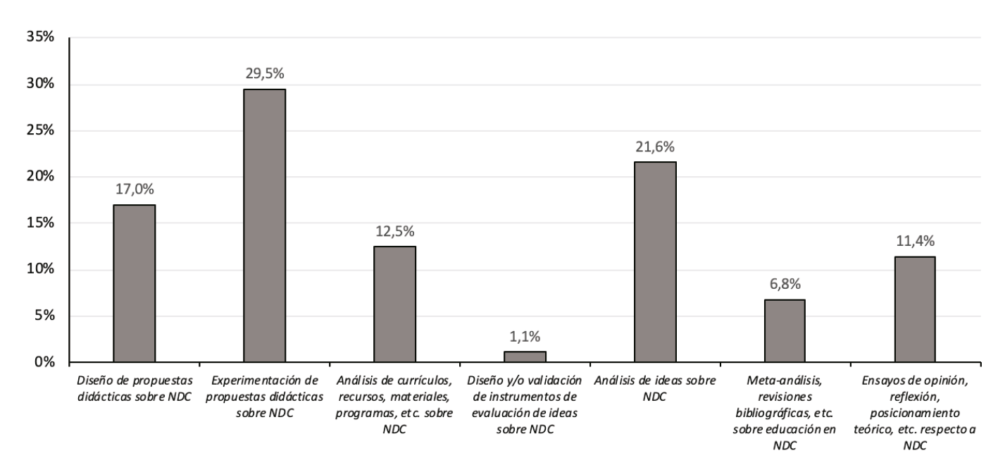 La variedad de trabajos sobre enseñanza de la NDC se representa en el gráfico II. Sin que ninguna tipología alcance la tercera parte de la muestra de artículos, la más abundante es la referida a la experimentación de propuestas didácticas sobre NDC (29,5%), seguida de análisis diagnósticos de ideas sobre esta (21,6%). A cierta distancia porcentual, se encuentran trabajos de diseño de propuestas didácticas para la enseñanza de NDC (17%), de análisis de currículos, materiales y recursos relacionados con esta (12,5%) y ensayos de opinión, reflexión y/o posicionamientos teóricos al respecto (11,4%). Bastante más escasos son los trabajos de revisión bibliográfica y meta-análisis (6,8%), así como casi insignificantes los concernientes al diseño y validación de instrumentos para evaluar ideas sobre NDC (1,1%).
