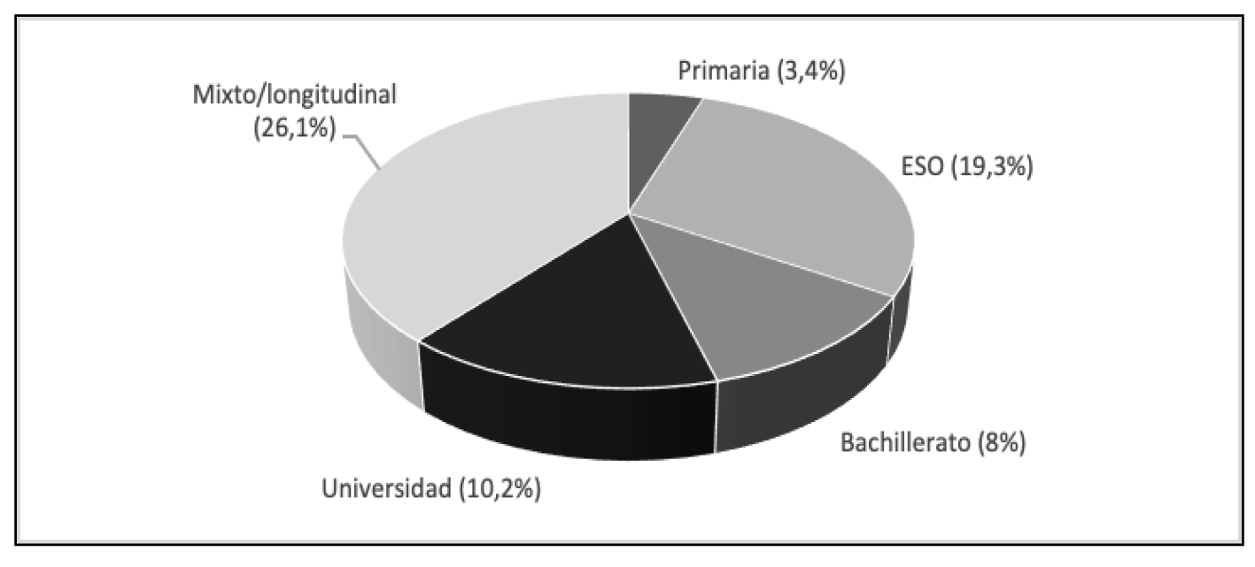 Atendiendo a trabajos centrados específicamente en el alumnado y/o en recursos, programas dirigidos a estos (67,1%), por tanto, excluyendo los de formación de profesorado, la etapa educativa que reciben mayor atención es la ESO (19,3%); y la que menos, Educación Primaria (3,4%). No obstante, los trabajos más abundantes son los de índole mixto o longitudinal (26,1%), esto es, trabajos que se dirigen a más de una etapa educativa consecutiva (e.g., Primaria y ESO, o ESO y Bac.). Véase la distribución en el gráfico IV.
