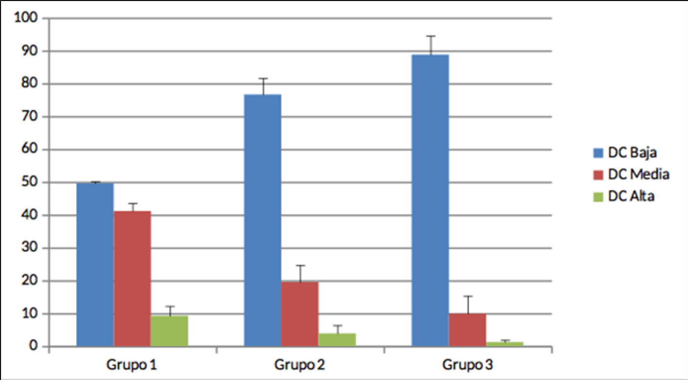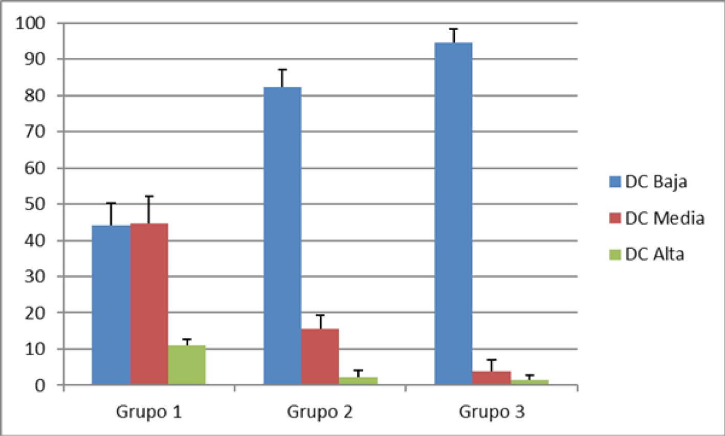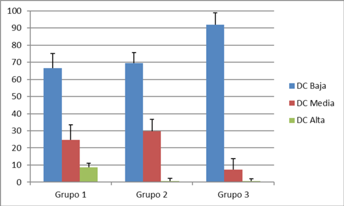 3(3) Recordamos que la lectura de datos se realiza a tres niveles: el grado de demanda cognitiva (DC) asociado a las acciones detectadas (DC baja, DC media y DC alta), los grupos o tendencias observadas (grupo 1: legislaciones que acumulan una mayor demanda cognitiva, grupo 2: legislaciones que acumulan una demanda cognitiva media, grupo 3: legislaciones que acumulan una menor demanda cognitiva) y las legislaciones autonómicas protagonistas del estudio (siglas descritas en la nota 1).
