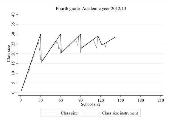 In the following we present some graphics on the relationship between class size and our class size instrument (Figure 1) for both 4th and 8th grades in 2012/13 (and 8th grade in 2011/12). As it can be appreciated (and previously indicated), it seems that schools do not exactly follow the law in terms of dividing their students in similar size classes when the school size reaches the class size limit. The actual class size and the class size instrument present a significant correlation of 0.77 in 4th grade and 0.41 in 8th grade in 2012/13 (0.50 in 8th grade in 2011/12) so, as a preliminary approach, it seems that this instrument may be enough correlated with the endogenous variable that it instruments, accomplishing the relevance assumption (needing also a Stock & Yogo, 2005, test of weak instruments to check this, as we will see in the Results’ section).