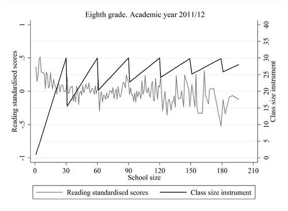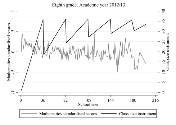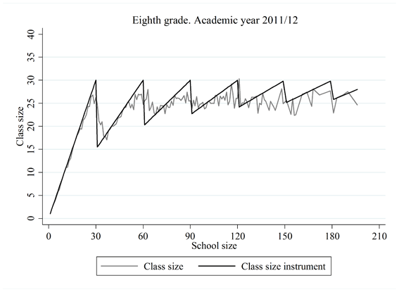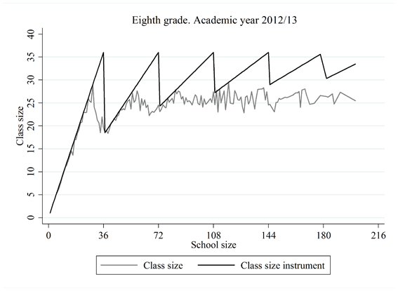 where j is the school; t the grade and academic year (t = 1 for 4th grade in 2012/13, t = 2 for 8th grade in 2012/13 and t = 3 for 8th grade in 2011/12); SSjt is the school size in that particular grade and academic year; CSLt is the class size limit by law for that grade and academic year (taking the value 30 for 4th grade in 2012/13 – and also for 8th grade in 2011/12 – and 36 for 8th grade in 2012/13); for any positive number n, the function Int(n) is the largest integer lower than or equal to n. For instance, for 4th grade in the academic year 2012/13 and school sizes between 1-30, CSIjt takes the values [1-30], [15.5-30] for school sizes between 31-60, [20.33-30] for 61-90, [22.75-30] for 91-120, and so on. Concretely, this class size instrument shows the class size which should have been set in the case that the schools had exactly followed the class size law when their school size reached the class size limit. As an example, whenever the school size reached to 32 in 4th grade in 2012/13 (2 students over the limit) then students should have been randomly separated into two classes of 16 students. Thus, to the extent that this class size instrument is based on an exogenous class size regulation, our instrument may follow the independence/exogeneity assumption.