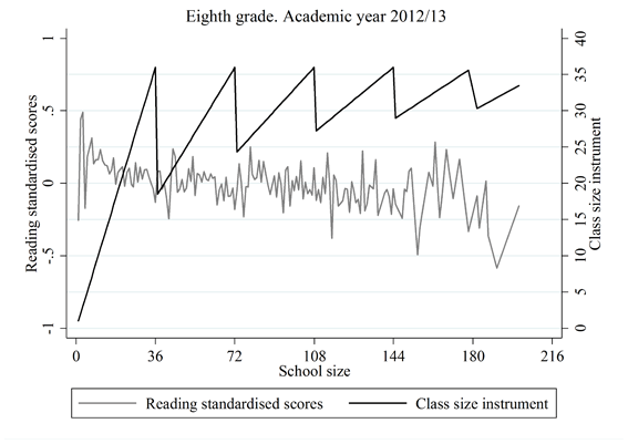 As indicated by Feir, Lemieux, and Marmer (2016), we need the discontinuity of the outcomes not being weak to make our identification strategy work. In order to check this, we have plotted the relationship between standardised administrative scores in reading (Figure 2) and mathematics (Figure 3), for both 4th and 8th grades in 2012/13 (and 8th grade in 2011/12), together with the class size instrument. It seems that there is a positive relationship between the class size instrument and students’ standardised administrative scores (contrary to what is found in the literature), to the extent that standardised administrative scores seem to mimic the behaviour of the class size instrument, even in the “jump-downs” of the cut-off points of the class size instrument. This correlation seems to indicate that our regression discontinuity strategy may work (if the class size instrument is not correlated to the error term; we will check this when applying the Wooldridge, 1995, endogeneity test in the Results’ section).