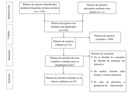 El primer cribado se realizó teniendo en cuenta los títulos, el resumen y una lectura transversal de los contenidos de los artículos, desechando aquellos en los que no figuraba información sobre (a) un abordaje explícito del concepto de libertad educativa y/o de enseñanza, en el sentido definido en nuestra investigación; (b) un análisis sobre el sistema educativo que explicite una determinada visión de la libertad de enseñanza o de libre elección educativa; (c) o se trata de proyectos o propuestas de intervención. Así pues, tras aplicar tales criterios al total de 1159 artículos arrojados por la búsqueda en base de datos y excluir aquellos duplicados, fueron 47 los documentos seleccionados para la revisión bibliográfica sistemática. Se resume el proceso en la figura 1.