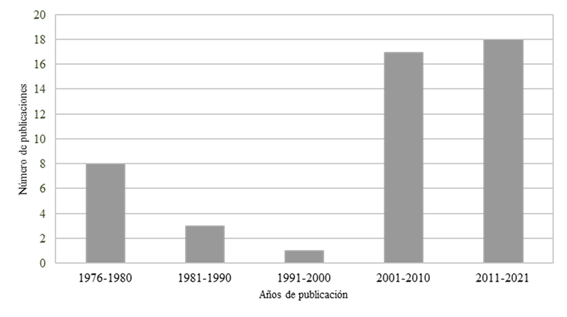 La validación se dio con los criterios de la Universidad de York complementados (Centre for Reviews and Dissemination, 2009): inclusión y exclusión, pertinencia e idoneidad, evaluación de calidad de los estudios, descripción de datos, actualidad, referencialidad y suficiencia. El criterio de inclusión y exclusión ya ha sido descrito en el proceso de cribado de la revisión realizada en bases de datos. La pertinencia e idoneidad se centró en discriminar aquellos estudios que tienen mayor relación con el tema de investigación. La evaluación de calidad y de descripción de datos hacen referencia a la validez y solidez del proceso de investigación realizado y a la robustez de los datos aportados. El criterio de temporalidad se basa en la pertinencia de obtener una perspectiva diacrónica del objeto de estudio. El criterio de actualidad se ha basado en la inclusión de aportaciones significativas desde los años 70 hasta el presente, recogiendo los avances más actuales del campo. En la figura 2 se observa el número de artículos seleccionados según año de publicación. En cuanto al criterio de referencialidad, señalar que la totalidad del corpus de referencias analizados son artículos publicados en revistas de reconocido prestigio e impacto, con revisión por pares. Por último, el criterio de suficiencia ha sido muy sólido, abarcando 47 referencias finales.