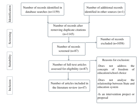 In the first screening, we read the titles and abstracts and scanned the article contents, excluding any which (a) did not report an explicit approach to the concept of freedom of education and/or school choice, in the sense defined in our research; (b) did not report an analysis of the education system that rendered explicit a particular vision of freedom of education or school choice; or (c) reported intervention projects or proposals. After applying these criteria to the total of 1159 articles identified in the database search and excluding duplicates, 47 papers were selected for the systematic literature review. Fig. 1 summarises the process.